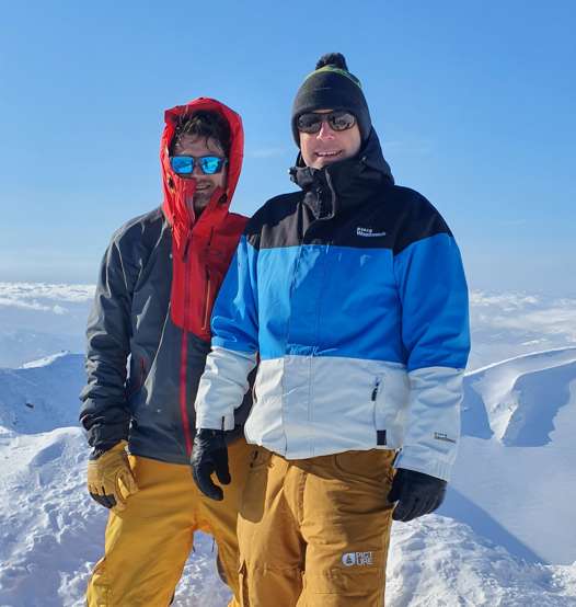 It was very cold at the top with the extra wind-chill and we were all fully layered up again, so we didn’t hang around too long. After a quick snack break and a few minutes to admire the view and take a few shots, it was time to think about strapping on our snowboards and skis and making the long descent, in spite of our legs feeling like jelly from the hike up.