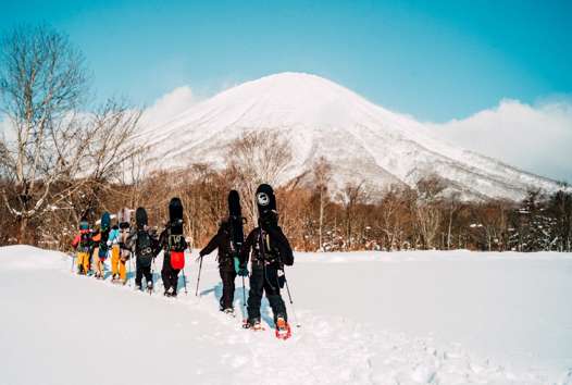 We planned an early start and set our alarms for 6:30am, and after getting packed and stoked up with some eggs for breakfast, we got on the road at around 7:30am. We drove about half an hour out of Niseko and round to the far side of Mount Yotei, then parked the vans in a small car park just on the edge of the trees at the foot of the volcano. After half an hour of getting ready and sorting out our kit, we set off at 8:30am. There were 11 of us in the group, the 8 of us from the house plus our 3 hosts and guides. 10 of us were using snowshoes with snowboards strapped to our backpacks, whilst Ralph was on his touring skis and skins.