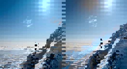 As we got higher the views became jaw-dropping, and we eventually started to pass through the line of small puffy clouds, which only a couple of hours ago had seemed to be miles above our heads. We were then looking down onto the clouds, and all the while the pitch was becoming steeper. As the gradient increases, the longer it takes to gain height as you have to traverse further, and your zig-zag path becomes wider. The wind was also starting to pick up, and every now and then a small whirlwind of snow would whip across the face towards me and hit me with an icy chill, so eventually the layers started to go back on.